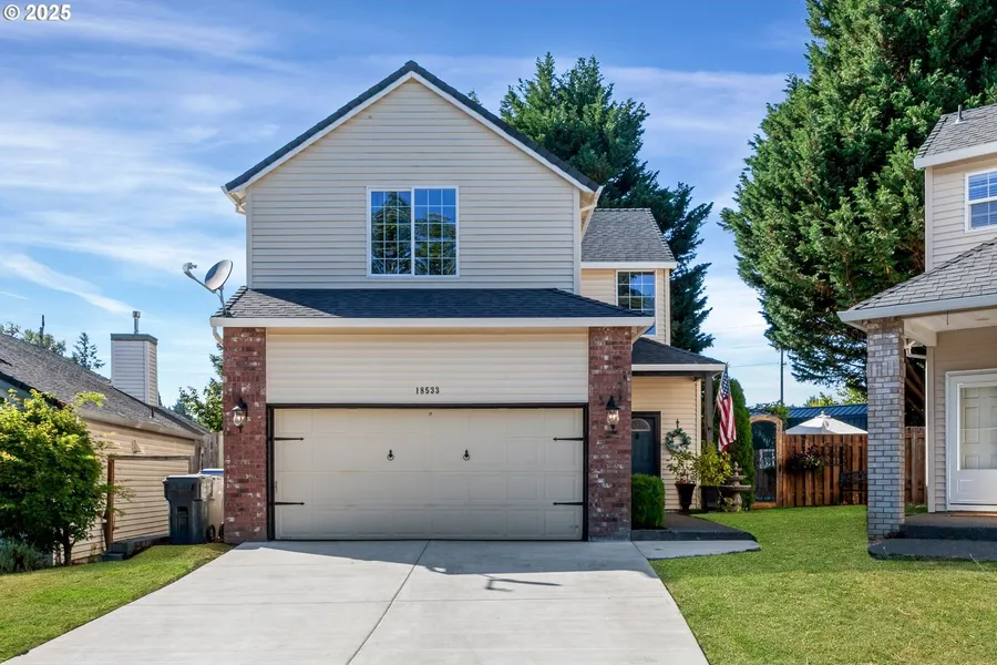 Welcome to 18533 SW Colfelt Lane a charming two-story Craftsman nestled at the edge of Sherwoods desirable Woodhaven community. From the moment you arrive, the curb appeal, extended driveway for added parking, and privacy of a dead-end street, set the tone for this thoughtfully updated home. Inside, you'll find warm laminate flooring throughout, white millwork and doors, designer lighting, and fresh paint tones that complement the home's welcoming atmosphere. The remodeled kitchen features a modern farmhouse design with subway-set tile backsplash, corian countertops, stainless steel appliances, and wainscoting accents that flow beautifully. The dining nook leads to covered outdoor living, extending the home to the outdoors. You'll also find a striking stone fireplace with stacked stone and live-edge mantle, creating a cozy centerpiece with a nod to the beautiful PNW lifestyle. Upstairs, the primary suite offers vaulted ceilings, a walk-in closet, and a beautifully remodeled ensuite with marble tile floors and dual vanities. Two additional bedrooms each include their own charming touches from accent walls and designer lighting to craftsman details, plus a full bathroom and separate laundry room with tile flooring and extra storage. Step outside to your own private retreat. The backyard is a standout feature, with covered outdoor living, raised garden beds, mature trees, a 10x19 barn-style shed, and mature landscaping filled with seasonal color. Not only a place to exercise your green thumb, but plenty of space to relax and entertain. Additional highlights include a two-car garage which hosts a storage/hobby room, a dramatic vaulted entry, and a powder bath on the main with custom furniture-style vanity and copper vessel sink. You'll also enjoy quick access to top-rated Sherwood schools, the YMCA, walking paths, and everything nearby Woodhaven and sought after Sherwood has to offer. No HOA dues!