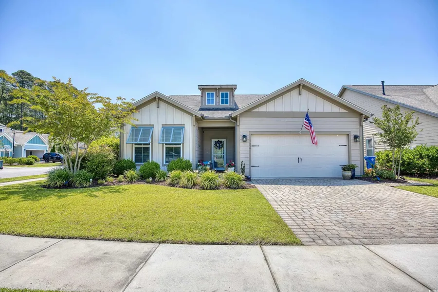 Gorgeous home in the Reserve, a premier neighborhood in the Market Common area of Myrtle Beach. Desirable coastal exterior, corner lot, brick paver driveway, lush landscaping, and irrigation system. The covered entry to the home is large and allows room for a bench/seating and decorative planters. Expansive welcoming entryway, open floor plan with vaulted ceiling and many updates. Beautiful quartzite countertops and white tile subway backsplash, large pantry, custom shelving, sliding door with electric shades, newer stainless appliances, and new designer lighting and ceiling fans. A gas line hook up is in place if you would prefer gas cooking. The huge island allows the chef plenty of room to spread out and provides plenty of room for guests. An amazing entertaining space! And newer carpeting in the three bedrooms! The formal dining room, just off the kitchen, is roomy and the perfect size for the entire family. Lots of memories to be made. Spacious primary bedroom and bathroom with a double vanity, garden tub, and over-sized glass shower with bench. You will absolutely love the huge walk-in closet and extra shelving. It's a split plan ranch where the two secondary bedrooms are at the opposite end of the home allowing you more privacy. They share a full bath, and there is also a powder room for guests. Laundry room has ample room to even include a desk or other piece of furniture. Extra large two-car garage has pull down steps to attic storage, and you know you want to house a golf cart there to add to the fun! And the outdoor space is also amazing! A beautiful screened porch adjacent to the large paver patio is the perfect entertaining space. Plenty of space for the grill, table and chairs, and more! Lots of games to be played out there! The yard is just lovely with privacy plantings and flowering shrubs, very serene. The lifestyle of the Market Common area is one of the best! Walking and bike trails, golf cart excursions, lake trails, shopping, restaurants, and movie theatre are there for your enjoyment. A great place for unique adventures! This location is just superb! Ride your golf cart to the beach, and just a ten minute drive to the Myrtle Beach International Airport, shopping malls, and close to so many wonderful restaurants. Community pool. Refrigerator conveys.