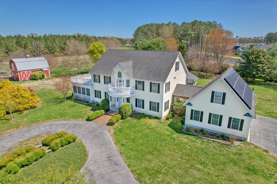 Welcome to your private retreat at 18605 Pettyjohn Road in Georgetown, DE. Discover nearly 17 acres of peaceful countryside living at this exceptional estate‹”conveniently located just 11 miles from downtown Lewes and 15 miles to downtown Rehoboth Beach. The property offers a total of four parcels that have been approved to subdivide. Step through the main entrance into a grand foyer featuring a circular staircase with carpeted steps, a striking chandelier, and warm sconce lighting. From this vantage point, catch glimpses of the kitchen, living room, and expansive family room. The open-concept family room includes a custom-built media and bookshelf unit and connects seamlessly to the kitchen, breakfast nook, and a walk-in pantry outfitted with a large sink, built-in shelving, wine rack, and mini-fridge. A secondary entrance from the breezeway leads to the spacious three-car garage. The kitchen is a cook's dream, featuring granite countertops, an electric range, a new refrigerator, and a single-basin sink set beneath windows that overlook the brand-new Trex porch. Cherry wood cabinetry adds both style and generous storage, with open sections perfect for display. Flowing from the kitchen is a formal dining room with large windows and views of the porch. Adjacent, the living room features a gas fireplace with a marble mantel and sconce lighting, and connects to both the dining area and an indoor swimming room. Separated by a sliding glass door, the swinning room is an oasis featuring an endless pool, waterproof walls, a slate floor, and ample room for relaxing. It offers direct access to the outdoors, ideal for year-round enjoyment. The breakfast nook leads to the back porch and also provides access to a private, first-floor primary suite. This well-appointed suite includes a faux fireplace with gas stove along with a laundry area, private water closet, and walk-in shower‹”perfect for in-laws or first-floor living. Constructed in 2023, the Trex back porch is partially covered for shade, includes lighting, an overhead fan, and a gas outlet ready for your barbecue setup. Upstairs, you'll find five additional rooms. The luxurious master suite includes a gas fireplace, a private terrace with awning, and a separate staircase leading outdoors. Its en-suite bathroom features a steam shower, quartz counters, and a private water closet. Three other bedrooms each offer unique features‹”one with a horse-stable theme and full tub/shower, another with a walk-in shower and private outdoor spiral staircase, and the fourth bedroom includes its own upstairs laundry area. Additional features include: R-45 spray foam insulated attic and conditioned crawl space, solar panels, newly installed 6-bedroom septic system, 6-inch variable speed well serving both house and irrigation, water conditioning system, and Rinnai tankless water heater. The property also includes a charming 25-year-old Conestoga-built barn with a conditioned and insulated upper level. Great for visitors, multi-generational living, or rental income, the guest apartment includes a kitchen, one bedroom, one bath, and a private entrance. A picturesque 70x35-foot pond, fed by its own dedicated well and electric service, creates a serene haven for wildlife. Two fully enclosed pastures, completed in 2023, enhance the landscape. One of them is thoughtfully planted with wildflowers that bloom in a stunning seasonal display. Nearby, an orchard of 20 apple, pear, and peach trees promises fresh harvests, while a separate grove of crack plums has proven to be exceptionally fruitful. With no HOA, you're free to bring your RVs, boats, horses, and car collection without restrictions. This is a rare opportunity to own a private compound in a prime location. Whether you're looking for a full-time residence, an equestrian haven, or a private weekend getaway, this estate delivers it all. Don't miss this opportunity‹”your dream retreat awaits!