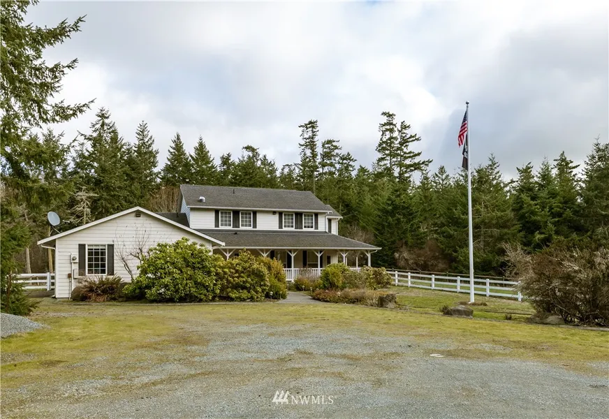 Charming farmhouse with a lovely wrap around porch tucked away at the end of a dead-end road. Privately set on just over 7 acres with a large, cleared meadow & wooded areas. Formal living room & a spacious family room with a cozy fireplace. Huge kitchen with endless cabinets & incredible counter space opens up to a spacious eating area with french doors to the back patio. Huge pantry. Separate formal dining room with french doors to the wrap around porch. Wood floors downstairs. All bedrooms upstairs. Spacious primary bedroom with ensuite 3/4 bath & walk in closet. Huge laundry room with a dog wash. Enjoy the ideal country setting located just minutes to town, the beach or NAS Whidbey.