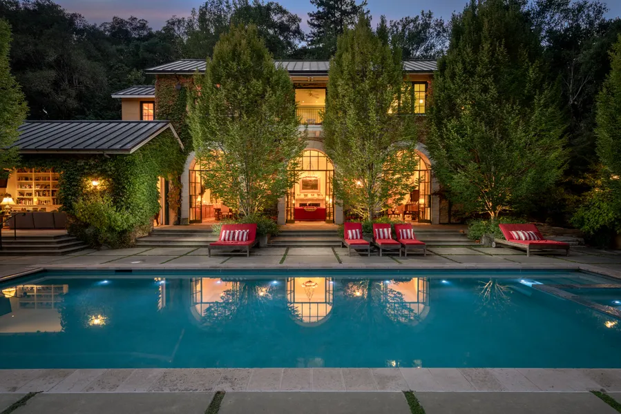 Imagine your own Mediterranean Villa, complete with a gorgeous pool surrounded by some of the most serene, luscious landscape and pure natural beauty to be found in Sonoma Valley. Romantic, evocative, playful, serene and exceedingly private. Over two miles of hand-crafted walking trails with beautiful rock walls allows one to experience the beauty of the land, as though time stood still. The villa sits into the land as though it was always there, yet it was designed and built in 2006 by famed architect Richard Beard, while working with BAR Architects. Named after the owner's childhood home in South America, Rancho Mineiro is both intimate and generous in scale with impeccable design. A sun-drenched guest cottage/pool house that functions as both a stand-alone guest quarters complete with full bath can serve as a spacious home office, which is how the owners currently enjoy it. The breezy indoor to outdoor flow, and sun-drenched pool rivals any romantic resort in Europe. The property also houses a rustic red barn with humble living quarters, stables, a welcoming pond, a hand-built stone chapel, a rose garden and a fruit orchard. And if that weren't enough, there is an all year round creek with steelhead that feeds into Carriger Creek. The villa allows for unforgettable entertaining moments, with its' grand 15-foot ceilings, stained concrete floors, hand-troweled plaster walls and three sets of magnificent custom arched steel doors that open to the pool with views to the east and Mt. Diablo in the distance. In the winter, the oversized stone fireplace is a lovely gathering spot for 2 or 20. Words and photos cannot capture the beauty and the incredible attention to detail that went into the development of the land and the beauty of the villa. The sellers lived on the property for 8 years while imagining, designing and curating items for the property from around the world. From the Balinese front doors, to the magnificent great room chandeliers shipped from a flea market in Buenos Aires, to the bespoke kitchen worthy of any chef or caterer, this is truly a one of a kind property, built with great taste and an abundance of care. All of this, less than one hour from San Francisco and just minutes to the historic plaza in downtown Sonoma.