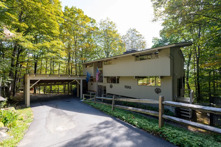 Stunning Deck House perfectly designed for light, views, and easy Vermont living. Soaring floor-to-ceiling glass in the entryway and stairwell connects all levels and creates a warm, treehouse-like feel, drenched in natural light. Honey-colored hardwood floors warm the main level, while wall-to-wall carpet and tile finish the rest of the spaces. The main level also features a striking stone fireplace, the architectural centerpiece of the expansive living room, complemented by a cozy propane stove and an intimate den with an electric fireplace. Step onto the deck, where new Pella sliders capture a framed summer view and expansive seasonal vistas, with a hot tub for year-round enjoyment. The primary suite includes a shower and peaceful outlook, while the superior guest suite showcases floor-to-ceiling glass, an en suite shower, and sunrise views. The lower level offers two spacious bedrooms sharing a double-vanity bath; ideal for family or guests. Thoughtful upgrades include a tidy laundry area, paved drive, and a large carport with space for two+ vehicles. Set at the top of Willard Road, this home embraces its natural setting with timeless use of wood and stone. With four bedrooms, three and one-half baths, and seamless indoor-outdoor living, it balances architectural beauty with everyday function; a fun, easy home to own and enjoy.