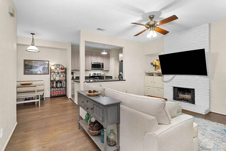 Welcome to this spacious 2-bed, 2.5-bath condo in Windsor Park, offering stylish updates and a functional layout. The kitchen was remodeled in 2016 with new flooring, granite countertops, and stainless steel appliances. The primary bath was updated in 2021, and the downstairs bath was reconfigured to fit a full-size washer and dryer. Hardwood floors were installed upstairs and on the stairs in 2014, matching the refinished original hardwoods downstairs. Additional improvements include new windows and balcony doors (2020), a refreshed deck/patio (2022), new upstairs toilet (2025), and HVAC updates (2021 & 2011). Enjoy high ceilings, a cozy fireplace, a private patio and balcony, and a bonus room ideal as an office or guest space. Community perks include a pool, tennis court, two covered parking spots, and gated access.