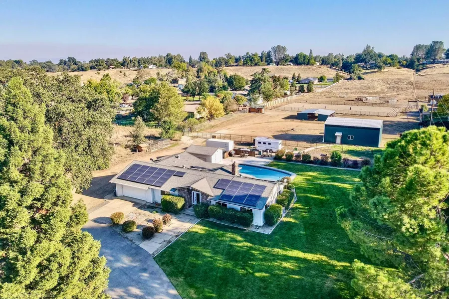 7.59-acre, 1,945-square foot home with 950-square foot in-law unit, pool and spa, shop, barn, arena and solar. Custom-built home with attention to detail this 4 bedroom, 2.5 bath home has been fully remodeled. The kitchen offers an open concept floor plan, stainless steel appliances, large island, pantry, custom cabinetry with granite countertops and a dining area. Enjoy this split floor plan with the primary suite that features a sitting area and a private door to the backyard. Beautiful luxury vinyl floors, cozy pellet stove, vaulted wood ceiling with beams and ceiling fans. Seamless indoor/outdoor living and entertaining to the serene backyard, with a covered patio, mature trees, fire pit area with stamped concrete, in-ground PebbleTec pool with waterfall and spa, hot tub, and spacious concrete decking around the pool with a pool room for storage and a separate garage. This incredible 7.59 acre property is perfect for horse enthusiasts, featuring fencing and cross fending, a 6-stall barn, riding arena that is 80'x100' with sand for riding comfort and hand-welded piping. In addition to the barn, there is also a shop measuring 30'X40' that offers 14' and 12' roll-up doors, for the RV and all the toys with heat and cold barriers. Attached two-car garage with plenty of parking. Separate 950-saure foot in-law, that features 1 bedroom, 1 bathroom, laundry area, kitchen with pantry, mini-split and separate utilities. Leased solar through Tesla Energy. Close to schools, I-5 and town.
