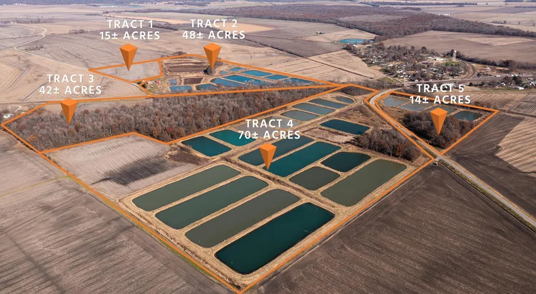 Tract 2 - 48 acres. 16 ponds ranging from 0.75 to 3 acres in size with 3 acres of timber. Two metal buildings that are 75x45 and 100x30 in size. Water levels can be controlled at each pond and it would be possible to drain some (or all) of the ponds and return it to highly productive cropland. Nearly a mile of road frontage along Gorham Road and White Lane.