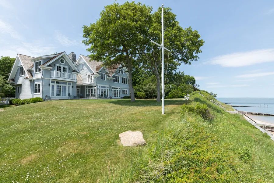 Take in sweeping views of Gardiners Bay from this 6 bedroom, 7 bath custom built waterfront home located at the end of Shelter Island's coveted Ram Island Drive. The 1.3 acre property features a 20x45 gunite pool, manicured gardens, 123 feet of sandy bay beach and a separate legal guest suite above the detached 2 car garage complete with bedroom, kitchen and full bath. Constructed with unparalleled craftsmanship, the main house features 5500 square feet of both open concept living and multiple spaces for work, movies and privacy. Once in a lifetime opportunity to live, work and entertain on the singularly spectacular Ram Island.