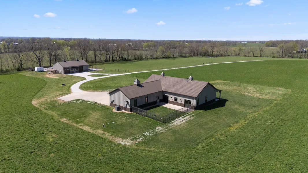 Experience the perfect balance of comfort, craftsmanship, and countryside charm with this custom Rick Ramsey-built home on 20+/- secluded acres just minutes from Clever, Nixa, and Springfield. Tucked beyond a gated entrance and a scenic quarter-mile driveway, this thoughtfully designed estate offers privacy, functionality, and refined rural living at its best. With a low-maintenance metal Morton exterior and a matching shop that mirrors the homes quality, its built for those who value both beauty and practicality. The land is open yet intimate, bordered by timber that creates a natural privacy screen. It's planted in alfalfa with a pasture seeded specifically for horses, offering hay production and grazing. Pipe fencing, a serene pond, and a fenced pet yard elevate the outdoor space, while the attached three-car garage includes a storm shelter. Inside, the home greets you with tall post-and-beam ceilings, warm wood finishes, and a stone fireplace that anchors the open-concept living space. The kitchen is functional and stylish, with rich custom cabinetry and stainless steel appliances that blend seamlessly into the home's rustic elegance. The primary suite is a quiet retreat with outdoor access, a spacious walk-in closet, and a walk-in shower. A secondary bedroom and a large flex roomcomplete with a deep sink, washer and dryer, built-in desk, and garage entryoffer versatile living options. The temperature-controlled outbuilding is equally impressive, featuring horse stalls with individual runs, a tack room, a wash bay, a chicken coop, and an entertainment-ready area with a pool table. Whether hosting guests, working on projects, or tending to animals, the space adapts to your vision. Located just 3 miles from Clever, 10 miles to Nixa and Republic, and 20 miles to Springfield, this property delivers high-end living with a rural soul. Call the Utecht Land Team at 417-766-5595 to schedule a showing on this unique real estate offering.