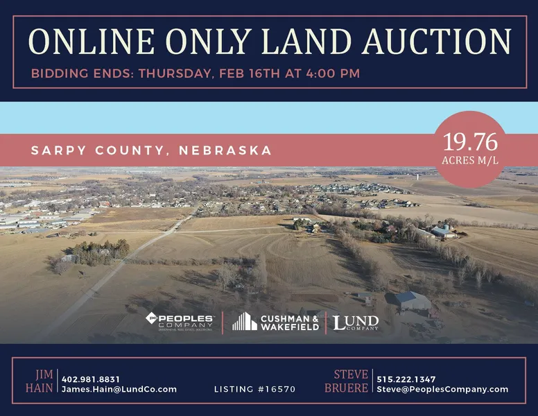 Sarpy County, Nebraska Online Only Auction - Mark your calendar for Thursday, February 16th, 2023! Peoples Company and The Lund Company are pleased to present 19.76 acres m/l located immediately south of Springfield, Nebraska. The individual Springfield, Nebraska tract will be offered through an ONLINE ONLY auction where all bidding must be done online through Peoples Company's BidWrangler bidding application located on our website. Bidding is currently LIVE and will remain open until Thursday, February 16th, 2023 at 4:00 PM Central Time Zone (CST) with closing taking place on or before Tuesday, March 23rd, 2023. A bid placed within 3 minutes of the scheduled close of the auction will extend bidding by an additional 3 minutes until all the bidding is completed.