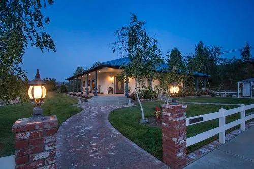 Capture the serene views of this hidden valley from this exceptional custom built home with Old World Hacienda charm surrounded by ranches, wineries, & rugged mountains. Thoughtfully designed & built with meticulous attention to detail using the finest quality materials. Enter this estate passing the groomed horse arena, round pen & the large horse pole barn topped with the signature blue steel roof this property is known for. Drive the tree lined driveway to the heart of this ranch nestled in the greenery of 100's of mature trees & beautiful gardens affording incomparable tranquility & inspiration. As you reach the top of this remarkable setting you will again see the incredible & unique blue steel roof. The massive oversized 4 car garage has 8 foot roll up doors front & back. The rear pad behind the garage is ready for your RV with electric service & sewer dump. Walk to the house along the gorgeous brick lined path past the lawn & rose gardens. As you enter the front door, you are immediately taken by the warmth of this well designed home with it's open floor plan, polished tecate tile throughout, brick accents, solid wood doors & cabinetry, & the tasteful Western Design... giving this home a timeless feel. Step out any door onto the wrap around veranda & enjoy unique views in every direction. The gorgeous kitchen features top of the line appliances, a commercial Wolf range, granite slab counter tops & a large center island complete with sink & a built in Wine Captain. Enjoy summer BBQ's on the veranda or patio with the custom brick BBQ & rustic sink with water flowing from an old fashioned well pump. Cook that unique meal in the in ground steel lined deep pit BBQ & pitch horseshoes while waiting for dinner. Cap off the evening with a soak in the spa located within a beautiful gazebo surrounded by trees, & lush gardens.This is Truly a one of a kind property...PLEASE CALL REALTOR CHRISTINA VAUGHN 760-807-1250. for more details.