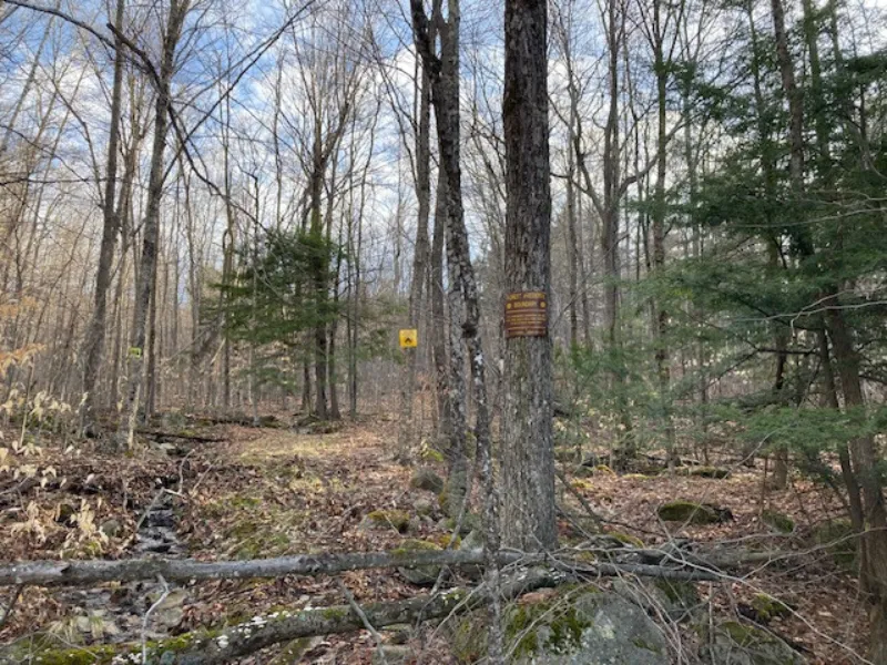 The forest is predominantly young mixed hardwoods, and various logging trails split from the main road, allowing ATV access to much of the property. From the main southeastern gated entrance, the internal road follows the southern property boundary, first climbing gradually to a small clearing with impressive views of the lower cliffs on Poko Moonshine Mountain to the north. The road then drops, crosses several small streams that have good culverts, and eventually splits, with the upper road dead ending at the border with state land where the public trail to the Poko Moonshine fire tower is a short walk away, while the lower road goes to an established campsite with a lean-to where Cold Brook flows into the first beaver pond.