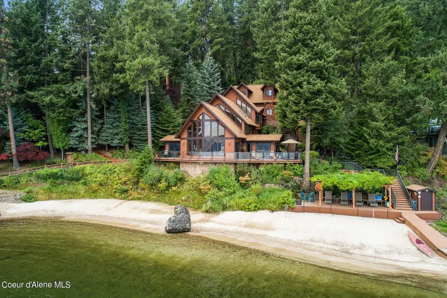 This Lakefront is an irreplaceable piece of Lk. CdA's shoreline with TWO waterfront parcels encompassing 232 ft of pristine sandy beach on the coveted West Shore, 15 min. to CdA. The current Beach House Is perched on the north parcel with the other south parcel vacant and available for Buyers dreams and ideas. This Exclusive waterfront blends convenience and tranquility while enjoying cocktails in the charming gazebo, al fresco dining on the expansive deck, sunbathing beneath the arbor or host unforettable gatherings on the oversized dock-complete with waterslide, diving board, crystal clear water and covered boat slip. Beyond its natural beauty, this property's south lot offers unparalleled flexibility. Re-design and build your dream estate, or additional residence for multi-generational living or enjoy the current lakefront retreat. Whether you seek secluded luxury, an entertainer's paradise, or and elite investment, this is a once-in-a-lifetime opportunity.