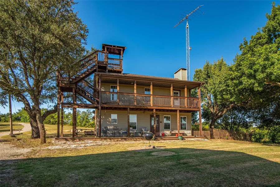 Super cool unique home and detached garage with guest quarters. Four bedrooms and 3.5 baths and several living areas inside and out. Main house has huge balconies front and back and covered porches. Guest house has half bath and laundry room downstairs and a full bath and beds and living area but no formal kitchen. Guest house also has balcony to view the ponds and woods that attract the regular visitors like deer, ducks, geese and other wildlife. Big bass in the never dry ponds! PERFECT FOR VRBO, EVENTS, WEDDINGS OR JUST A MAGICAL PLACE TO CALL HOME! Property is on 27.77 acres so more land available. Next door is a 15 acre farm and huge greenhouse. Good neighbor to have with food prices! Modern storm shelter for that just in case day. All this is on 11+ ag exempt acres with 3 ponds, deer, pasture and woods and beautiful nature all around. Secluded and private yet perfect location located between Bells, Sherman and Tom Bean. Currently leased.