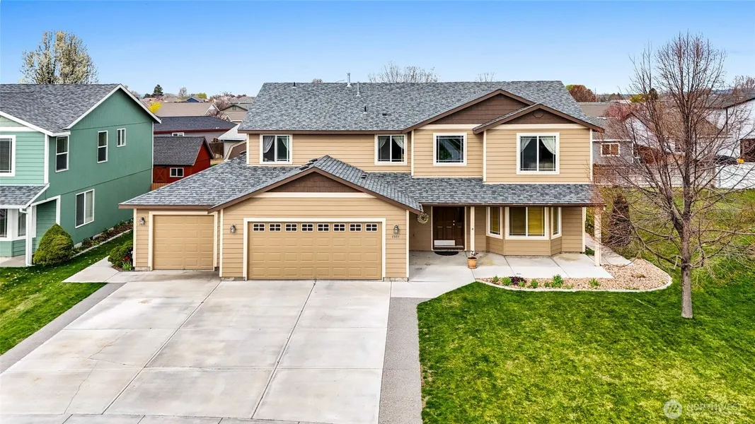 Five minutes from downtown, this 5 bedroom, 3 bath home is a spacious two-story home built in 2006 by Aho Construction, offering 2,705 square feet of living space and a beautiful staircase up to the second floor. It features an open concept kitchen/dining area, 5 bedrooms and 3 bathrooms, living room, family room, and large family room upstairs. It sits on a 7,646 sq ft corner lot in a peaceful neighborhood with a very private backyard with arbovitae, with the home close to local schools and shopping. The tulips are in bloom! It includes a Rainsoft whole-house water softener, including 2 outside faucets. There are TWO laundry rooms! (Primary Bedroom Closet and Upper Utility Room). There are two covered patios and a special bbq area in back