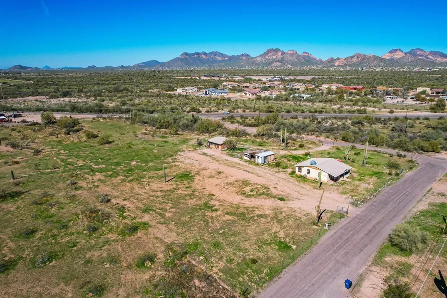 5 acres with breathtaking views of Superstition, Four Peaks and Goldfield Mountains with frontage on the Old Apache Trail. Development potential to design your dream ranch, subdivide into smaller lots or check with the city on commercial possibilities off frontage. Currently has 2 bedroom 1 bath brick house and brick casita both with newer 200 amp service panels, roofs, new insulation. Private well to both houses. Easy access to many horse riding trails, Superstition wilderness, Canyon lake. Seller financing available