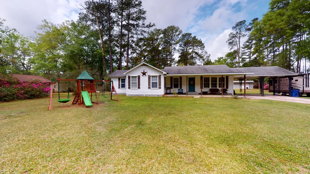 a game room. Outside you will find a welcoming front and large back porch and attached decorative two car carport. The yard is