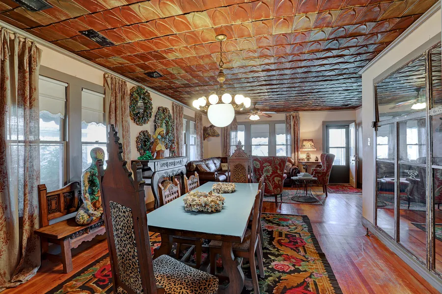 The house is uniquely decorated with eclectic and artistic detail. A one-of-a-kind mirrored wall adds dimension to the dining room and a tin ceiling adds texture throughout the combined living/dining space. The ceiling tin was imported from a turn of the century mansion in Galveston. A screened-in bonus room with a bar area has room for dining and lounging. The master bedroom includes an en suite bathroom with separate shower and clawfoot bathtub.
