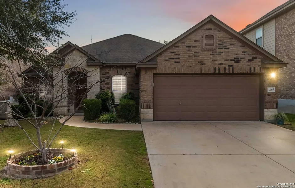 **Gated One-Story on Huge Lot with No Rear Neighbors + Walk to Schools** Tucked inside the gated Prospect Creek section of Kinder Ranch, this well-maintained one-story brick-and-stone David Weekley home pairs a functional, high-ceiling layout with backyard privacy and a location that stands out in the neighborhood. The open concept design creates a strong kitchen-to-living connection, while still offering dedicated spaces for work, dining, and everyday flexibility. Tile flooring runs through the main living areas, complemented by wood floors in the separate dining room and private den - ideal for a home office, music room, or second living space. The island kitchen is positioned for both daily use and entertaining, featuring pendant lighting, stainless steel appliances, ample cabinet storage, and an adjacent breakfast area with views to the backyard. The primary suite is set apart for privacy and includes an en-suite bath with dual vanities, a soaking tub, separate shower, and a walk-in closet. Step outside to a covered back patio overlooking a spacious fenced yard with green space behind - no rear neighbors. Situated on one of the largest lots in the neighborhood, the lot offers room that may be suitable for a pool (buyer to verify HOA/city requirements and approvals). A few steps away, a neighborhood access gate provides direct access toward Kinder Ranch Elementary and Pieper High School - an uncommon convenience that helps differentiate this home from others in the community. Residents enjoy resort-style amenities including a swimming pool, sports court, trails, and common areas (amenities subject to HOA availability). Convenient access to San Antonio International Airport (SAT), nearby shopping and grocery options including H-E-B, and Texas Hill Country destinations.