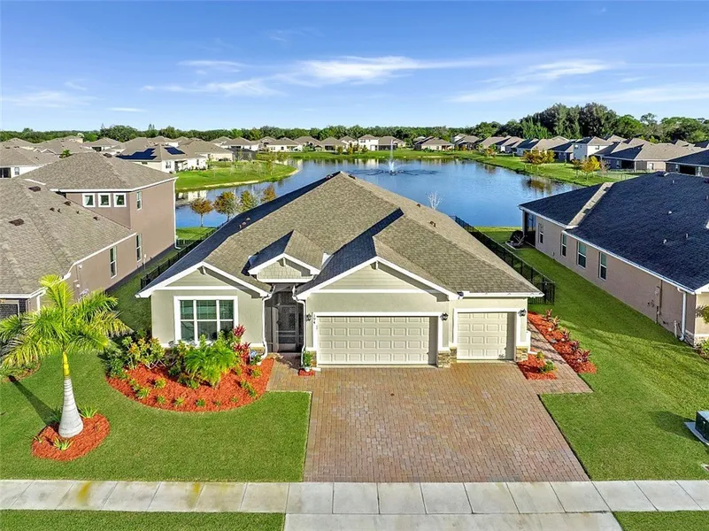 Better than new! Built in 2023 with $30,000+ in upgrades, this 3BR/3BA home with a 3-car garage features impact windows and doors throughout. Enjoy a screened epoxy patio overlooking a fenced yard with lake and fountain views (plenty of room for a pool). The kitchen offers double islands, quartz countertops, stainless appliances, pantry, and breakfast nook. The primary suite stuns with a tray ceiling and two custom walk-in closets. Additional upgrades include epoxy garage floor, gutters, screened front porch, and quartz bath vanities. Gated community, low HOA, central location-don't miss it!