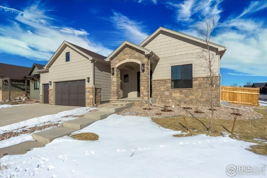 Move-in Ready Home in Greenspire at Windsor Lake, the Quandary offers the ease of single-story living on a spacious corner lot with a 3.5-car garage, a finished basement, and a covered patio. Just steps from Windsor Lake trails and downtown, it combines modern design with the best of Windsor living. Release your inner chef in the gourmet kitchen featuring custom alder cabinetry that extends to the ceiling with stacked uppers, veined quartz counters, and brushed brass accents. An oversized island with prep sink creates the perfect gathering spot for meals or entertaining. The open-concept main floor is centered around a stone fireplace, bringing warmth and a natural focal point to the space. The primary suite is its own retreat with a freestanding tub, dual shower heads, and brass fixtures for a spa-like experience. Everyday conveniences include a mudroom, built-in laundry cabinetry, and a laundry sink. The finished basement is designed for connection and versatility, with two bedrooms, a full bath, and a spacious rec room that can host game nights, guests, or a home gym. A moody bar with dark cabinetry, brass hardware, and a sleek backsplash sets the scene for a nightcap or evenings of entertaining. Professional front yard landscaping and fencing complete the home, so all you need to do is move in and enjoy Windsor Lake and downtown Windsor just outside your door. Schedule your private showing today and see why Greenspire is one of Windsor's most loved neighborhoods.
