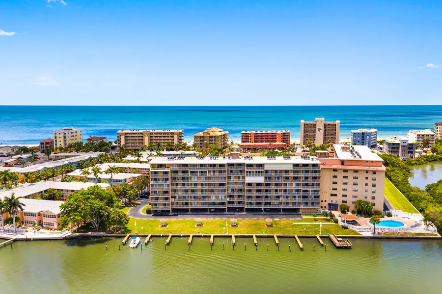 With breathtaking Intracoastal views, this 2-bedroom, 2-bath condominium is the perfect second home-vacation rental property. Situated in a resort-style community, this condo has been tastefully remodeled, furnished and accessorized and shows like a model. The living room has a recessed electric fireplace and every room has a wall-mounted flat-screen TV and motorized shades. And most importantly, the master bedroom and great room have spectacular Intracoastal views and direct access to an inviting balcony. The 5th-floor elevation provides the guest bedroom and kitchen with stunning Gulf views. The AC is brand new. A 7-day minimum rental period makes it the perfect vacation home that could pay for itself as a desirable rental. Located on 4.5 acres, this community has amenities for everyone heated pool and spa, tennis courts, 20 open-use boat docks, tiki hut-style picnic tables, rooftop observation deck, fishing pier, fitness center, shuffleboard court, putting green, a clubhouse with his and hers saunas and designated storage areas for paddleboards and bikes. And best of all, the beach access is located directly across from Bayshore Yacht and Tennis Club and puts you on the glorious sandy beaches and the emerald green waters of the Gulf of Mexico in just minutes. This condo comes with one of the few premium parking spaces that are covered and just a few steps from an elevator. Guests will find plenty of guest spaces. But who needs a car with all the restaurants (especially the top-rated Salt Rock Grill), pubs, coffeehouses, sandwich and pizza shops, parks, putt-putt golf course, boat rental company (also rents kayaks, paddleboards, scooters, bicycles) and shops all within walking distance in the pedestrian-friendly Indian Shores? Floorplan slide #44. See video at https://vimeo.com/manage/videos/732343434.