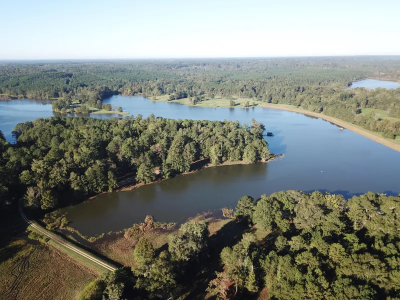 After entering the gates at Bug Hall, you will drive along a winding, scenic gravel road almost 2 miles and end up at one of the most notable features on the property, an incredible 100 acre lake! This is a spectacular site that one will have to see to believe. This lake was constructed decades ago as a watershed lake and has provided great fishing and lots of fun over the years. There is a nice 3 BR 4 BA cabin with a large deck currently under construction and situated on a bluff overlooking the lake...the view is breathtaking! It is common to view all types of wildlife from the deck including deer, turkey, wild hogs, ducks, canada geese and even a bald eagle or two. Below the cabin and on the lake is also a boat house with plenty of room for a couple fishing boats.