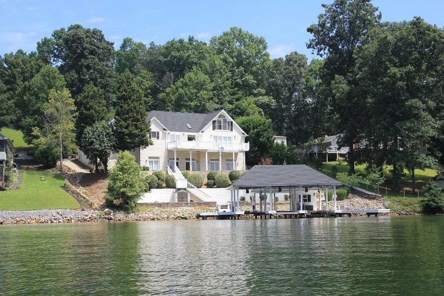 The custom designed boat dock is perfect for entertaining with 3 covered slips, boat lifts, fishing pier, swimming area, bar and party area, plus an on-shore brick patio with fire pit to expand the party. Well planned exterior with extensive landscaping and hardscaping for a low maintenance yard and a concrete walkway for easy access to patio and dock area.