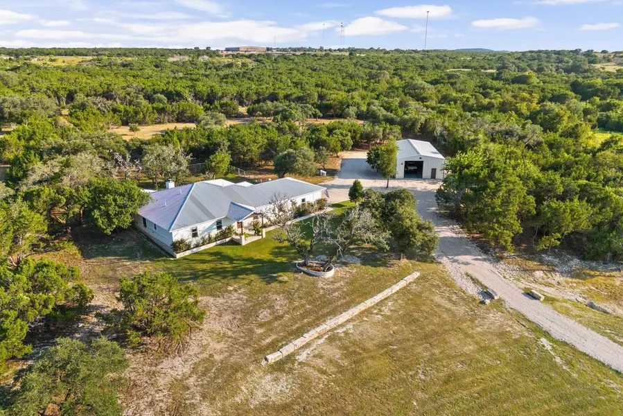 Luxury Hill Country Retreat on 11 Private Acres. 3 bedrooms plus a home office. Behind a private gate and winding drive, this custom 2,909 sqft Hill Country retreat offers refined living just minutes from Burnet. Elevated for scenic views and ultimate privacy, the home blends classic Texas charm with modern design. Inside, cathedral ceilings and expansive windows fill the open-concept living area with natural light. A dramatic corner floor-to-ceiling stone surround fireplace anchors the space, while the gourmet kitchen features gleaming granite counters, stainless appliances, custom cabinetry, deep storage drawers, and a large walk-in pantry ideal for small appliances and prep. The thoughtful layout includes a dedicated home office and a separate flex space perfect as a second office or mudroom. The private owner’s suite offers a spa-like bath with a walk-in shower, soaking tub, and dual granite vanities. A split-bedroom design ensures privacy for guests. Outside, an oversized covered patio shaded by mature trees invites quiet mornings and sunset entertaining perfect for summer barbecues. A low-profile fence offers security for pets without blocking views. Additional features include a poured-concrete walkway, 2 car garage attached to house and Shop with 1/2 bath is detached, ideal for hobbies or storage ~ Wildlife exemption keeps taxes low ~ Sale includes adjoining 5-acre raw land (separate legal lot) for expanded privacy, future build, or investment. Total of 11 acres, must be sold together