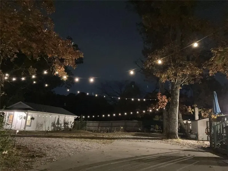 Between the carriage house and the main home is a large open area—an inviting, flexible space perfect for gatherings, fire pits, or simply enjoying the glow of the string lights in the evenings.