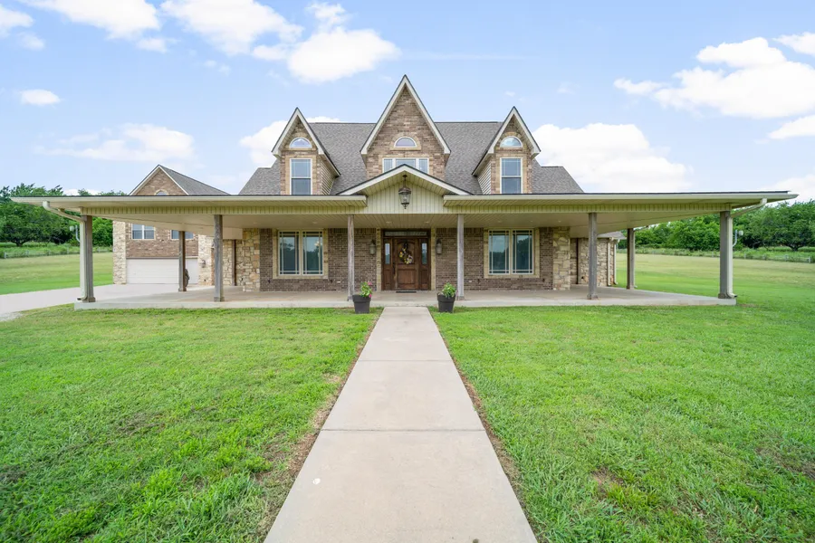 This magnificent home on 7 acres offers over 4400 sq ft of living space. An open living area w/cathedral ceilings, beautiful floor to ceiling rock fireplace and double french doors to the patio. Guest bathroom off the living area. Built in speaker system in the living room and out to the patio. Two large open dining areas surrounded by easy open windows. A gorgeous kitchen that boasts a 6-burner commercial stove, double ovens, two large islands, granite countertops, double sinks and an ice maker. Incredible craft room/office area with large granite top island and 4 desk areas. Matching alder wood throughout the whole home including crown molding in every room. The details in this home are perfectly set. Three spacious bedrooms, en-suite bathrooms and walk-in closets. Beautiful inground saltwater pool including a diving board and basketball goal beside the covered patio perfect for entertaining. Above the 2-car garage is an apartment with a full bathroom, kitchen with granite countertop, pool table and air hockey table. Shop building w/bathroom, concrete floors and spot for your RV or tractor. 30x30 Barn, lean-to, tack room, and additional fencing ready for your animals! This is a slice of Ranch Heaven right outside of town. It is located 2.5 hours from Dallas and 1.5 hours from OKC!
