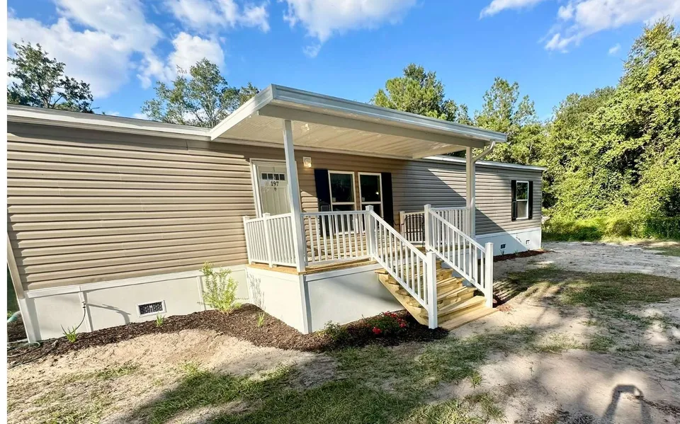 Charming, brand new two-bedroom home with two bathrooms. Each at opposite ends. The setting is beautiful among the large pecan trees on a huge lot, almost 1 ac (.90). Spacious covered front porch makes it ideal to sit and relax OR choose your covered back porch to chill out on. Brand new Goodman AC. City water but septic tank. Skirting is FHA-approved, Duroc, with each section having vents. A home is on the market, next door: 4/2 181 NE Windall. See MLS #129387, if you have family or friends who want to be close. This is it!