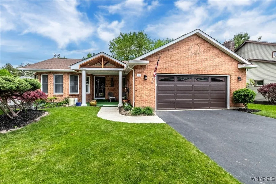 Welcome to this beautiful brick front 2 bedroom 2 bath custom built ranch. It has a stately columned entryway with a beautiful front door, which leads to the foyer with skylight. The large living room, great for entertaining, has hardwood floors, large bay window, ceiling fan, and corner fireplace. Behind the living room is a flex room with a vaulted ceiling, skylight, tiled floor and French doors leading to the back covered porch overlooking the lovely yard. The kitchen has oak cupboards, wide plank Pergo floors, walk in pantry, updated tile backsplash and quartz countertops. Both bedrooms have hardwood floors as well. The primary suite has 2 closets and a bath with jacuzzi, stall shower and skylight.. The basement has a laundry area with built in cupboards, a finished room and workbench area, and unfinished area for storage. The garage has a service door, work area, drain, and newer door.