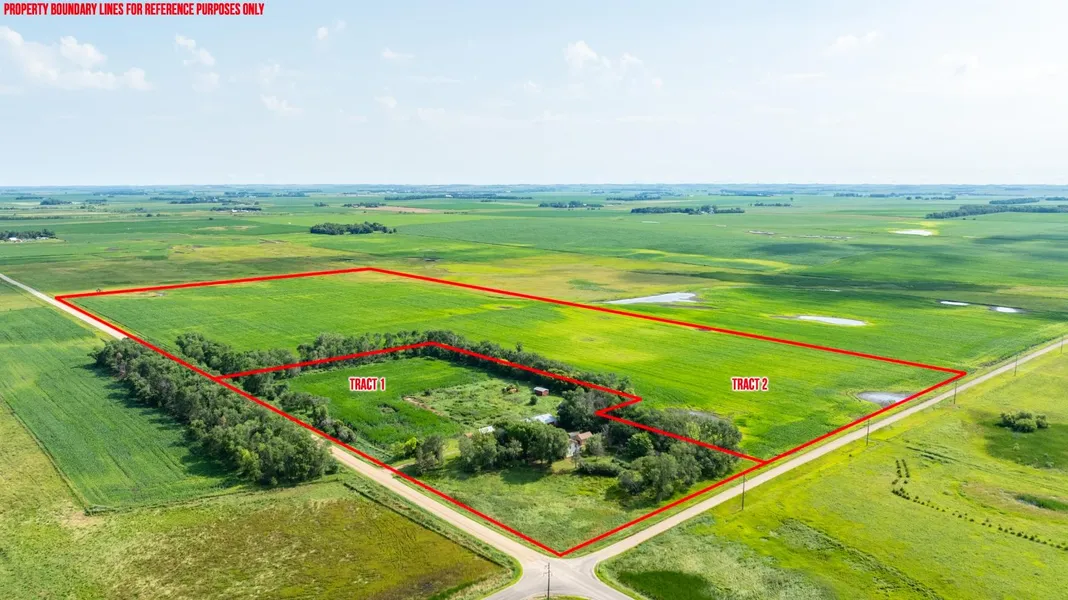 Tract 1 12.5+/- Acres: This 12.5+/- acres includes an older 1 story home with kitchen, living room, dining room, bathroom and 4 bedrooms on the upper level. The home includes a partial basement; and outbuildings include a 14 x 24 detached garage, 40 x 72 machine shed, 3 14 x 20 sheds and 20 x 36 shed. The property has a forced air LP gas furnace. This acreage has many nice trees and is adjacent to an oil road. The acreage will be surveyed at sellers expense if sold separately.