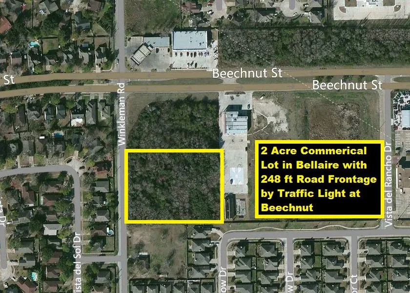 Highly Desired & Visible 2 Acre Commercial Lot only 250 ft from Beechnut Traffic Light near Hwy 6 & Westpark Tollway. Property has 248 feet of road frontage on Winkleman Rd/Gains South. Beechnut is a high traffic 4-lane divided street with traffic light. Low Taxes! All utilities! Perfect for Townhouses, Retail Center, Convenience Store, Medical/Dental Offices, Animal Clinic, Urgent Care Center, Professional Offices, College/Private School, Car Sales Lot, Restaurant/Fast Food, Dry Cleaners, etc.
