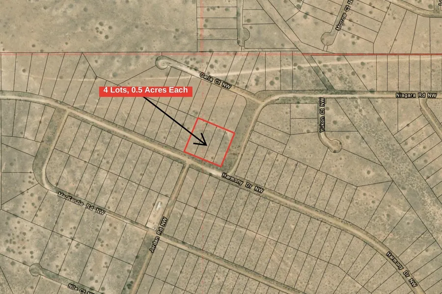 Four adjacent 1/2-acre lots (2 acres total) in Rio Rancho, including a desirable corner lot. Located in the quiet high desert, this property offers sweeping views, endless blue skies, and peaceful surroundings. No HOA and countless possibilities. Link to Google Maps location: