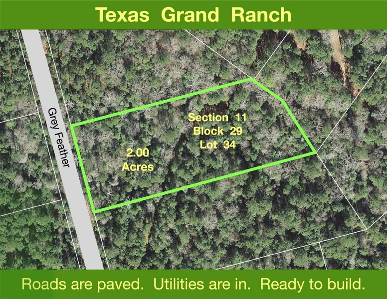2.00 ACRES IN TEXAS GRAND RANCH > EXTRA QUIET ROAD AT THE TOP OF THE RANCH > MATURE MIX OF TREES > Ready for peace & quiet & privacy? Ready to build. Start building whenever you want. Choose your own builder. EZ access to I-45. Texas Grand Ranch is a large lot, wooded community in the rolling hills. Country lifestyle for your custom forever home. Mature trees, paved roads, water & HIGH SPEED fiber optic internet. Covered pavilions, parks, ponds, playgrounds, BBQ areas. Minutes from shopping, dining, schools, hospitals, and entertainment. Low taxes - No MUD tax. HIGH & DRY - Average elevation is 325’ ASL. Surrounded by Nat’l Forest (161,508 acres) & State Park (2,083 acres) with 100’s of miles of hiking, biking and horseback riding – boat launches & beaches. Come home to Texas Grand Ranch.