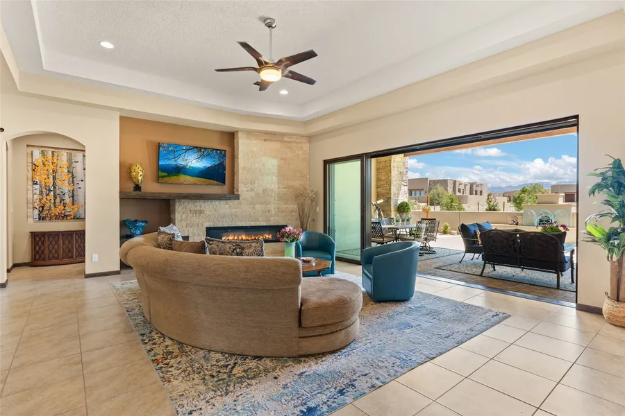 Imagine waking each morning to golden light painting the Sangre de Cristo mountains in shades of rose and amber, streaming through expansive east-facing windows. Nestled on a coveted corner lot in exclusive Las Campanas, this semi-custom property captures your heart from the moment you step through the welcoming courtyard. Picture yourself hosting sunset gatherings on beautifully landscaped brick and stone terraces that flow effortlessly indoors. The living room's dramatic four-panel sliding doors glide open, while your guests gather around the deep portal's romantic kiva-inspired fireplace as you prepare culinary favorites at the integrated outdoor gas kitchen. The gourmet kitchen is spectacular-top-tier appliances, a commanding 12*6-foot granite island, wine cooler, and walk-in pantry. The primary suite is pure tranquility with stunning mountain views, spa-inspired soaking tub, oversized walk-in shower, and dual closets. With five bedrooms and five baths, there's room for everything you love. Three of those bedrooms surround a spacious hub perfect for your home gym, meditation studio, or playroom, while the detached casita offers welcome privacy as a spacious office or en-suite guest quarters. Share tranquil mornings in the sunroom or cozy evenings in the living room by the six foot natural gas linear fireplace. This home shines with smart-home functionality, soaring arches, elegant tray ceilings, and authentic stone walls. Three lush green belts embrace the property, framing distant views of both the Sangre de Cristo and Jemez ranges. Watch spectacular sunrises and sunsets surrounded by three dozen evergreens and abundant birdlife in this Audubon Sanctuary neighborhood. Minutes from The Club at Las Campanas, enjoy world-class golf and resort amenities. Memberships are available for purchase and upon approval. The seller offers curated furnishings as a separate bill-of-sale for an effortless, move-in-ready experience.