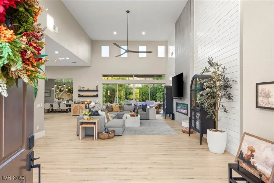 Completely reimagined from top to bottom, this stunning single-story in Anthem Country Club rests on a private cul-de-sac, offering 4 bedrooms, Glassed in Den/Office, 3 baths, and 3,216 sq. ft. of refined living. Soaring 20-ft ceilings and walls of windows fill the open layout with natural light. The great room features stacking sliders to a covered patio and lush green backyard with built-in BBQ and updated spa with water feature. The chef’s kitchen showcases a waterfall island, high-end appliances, and abundant storage, while the separate dining area with designer light fixture opens to the outdoors. The primary suite offers direct backyard access and a spa-like bath with soaking tub, dual sinks, walk-in shower, and custom closet. Additional highlights include plantation shutters, designer finishes, and a spacious 3-car garage. Set within the guard-gated Anthem Country Club, this residence combines resort-style living with rare elegance—an exceptional opportunity seldom available.