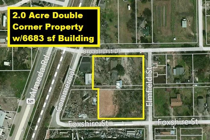 2+ Acre Double Corner Property w/6683 sf Building by Almeda Rd in SE Houston. Property consists of 2 adjacent lots extending from Broadhurst Dr to Foxshire St w/280 ft Broadhurst Dr Frontage, 250 ft Foxfire St Frontage & 332 ft Elmfield St Frontage. Building has kitchen, bathrooms, large multipurpose room & offices. Located inside the Beltway & West of TX-288. Great location for Church, Office/Warehouses, Performing Arts Theater, Retail Store, Truck/Auto Repair, Truck/Auto Sales Lot, Community Center, Medical/Dental Clinic, Emergency Center, Fitness Center, Day Care Center, Ice Bar/Club, Private School & Dog Boarding Kennels. No Sign on Property! Call LA for Appointment!