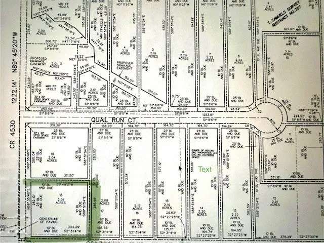 2 acre lot in a new Quail Creek Subdivision with no HOA. Bring your own builder and build your dream home in this beautiful country setting. Well and Septic will be needed. No timeline to build. Barndominiums are allowed with 30% masonry at front elevation. 2000 sqft minimum. No mobile homes or manufactured homes. This lot will have entrance off the county road.