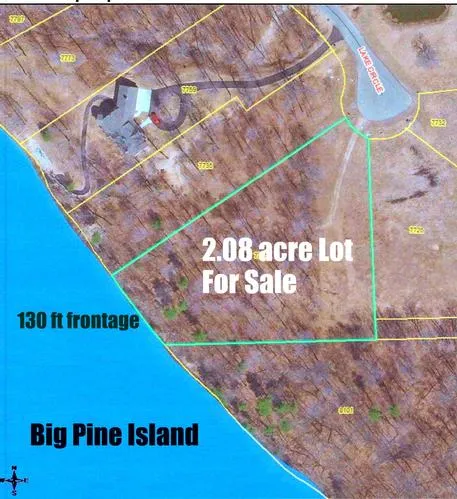 130 Ft of water frontage on 2.08 acres located at the end of a Cul De Sac on the East side (Beautiful Sunsets!) of Big Pine Island. How many buildable lake front lots with 2 acres are left to provide not only room for your dream home but space for privacy, yard and room for the toys ! Lot has no wetlands and is a mix of open area ready for building and wooded area with trees providing privacy. Improved lot with public sewer, natural gas and underground electric and cable. Big Pine Island is a 223 acre all sports lake also known for its great fishing.