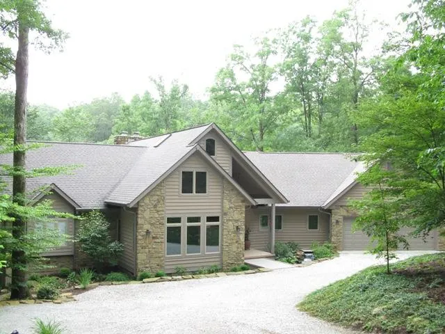 Uncompromised quality in design, construction and care, this Brown County beauty takes advantage of every aspect of its wooded setting on 1 of 2 lakes in Turning Tree. Skylights, cathedral ceilings, floor-to-ceiling windows, dramatic stone fireplace highlight the great room. Roomy loft with poplar stairs and railings is a wonderful place to relax and still enjoy the view where the woods meets the sky. Master suite on the main floor includes walkin closet and large bath featuring whirlpool tub and separate shower. The kitchen is the new living room and this one makes you feel right at home. Custom made by local craftsman, there's plenty of cabinetry including glass fronts and builtins. The dishwasher is raised to make loading and unloading easier and refrigerator is recessed to fit flush with the cabinet line. Beautiful tile floor extends to the dining area looking out on the back multi-level decks. Convenient office is located off the front entry way. Lower level will be a favorite spot with its wetbar, entertainment center and stone fireplace. There are 2 more bedrooms and spacious full bath. Outdoor landscaping is the finest you'll see. A waterfall and rushing creek greet you at the main entry. Off the back of the house (which reaches 3 stories high) there are multiple decks and patios, sumptuous lily garden all fenced in so pets are safe. Gentle steps lead down to a grassy walk to one of the shared lakes here. This area is the best in Brown County for quality homes and amenities. Nature is a priority!