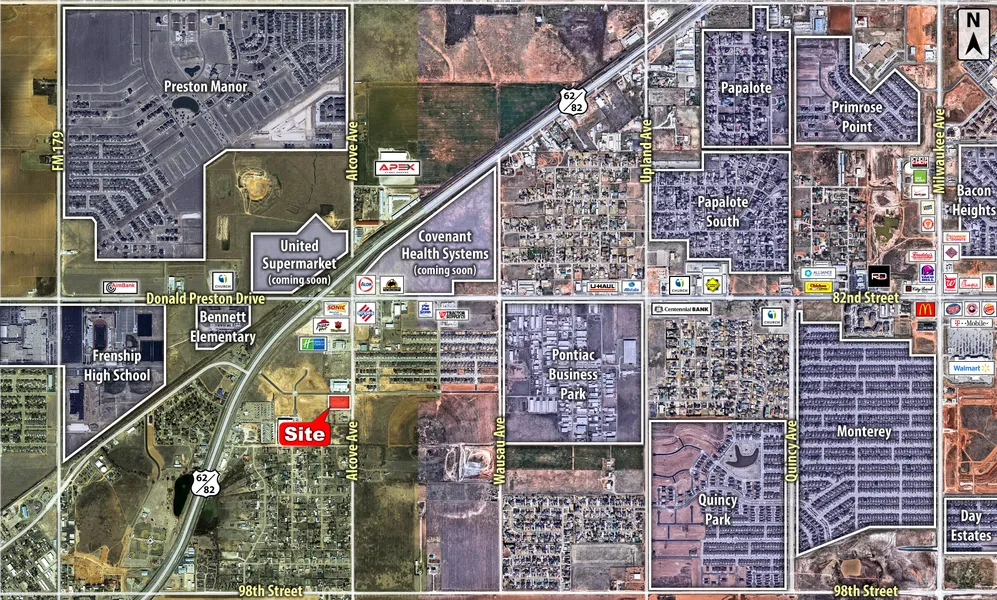 A large development tract in growing southwest Lubbock. In the perfect location for retail, restaurant, or office development. Frenship High School and the Preston Manor subdivision sit 1.5 miles to the west and the Milwaukee Corridor is 1.5 miles to the east.
