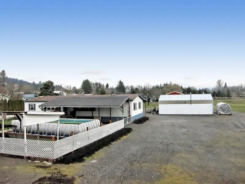 2.62 quiet acres close to town! 24x48 rear shop with 15' roll up garage door, water (80 gallon hot water heater, partial concrete floor (from front of shop to halfway point, approx 24 ft in), 30x60 concrete pad in front of shop, 12x24 lean-to. Additional 24x36 shop w/air plumbing and hot/cold water. 18x36 above-ground swimming pool, hot tub. Kitchen w/island, pantry, skylights