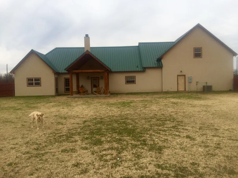 There is a 3 car detached garage and sidewalk leading to the house. When you walk up to the front door of this home you are meet with a massive wood accented front porch. Outside, behind the house is a huge backyard secured by a privacy fence. There is a covered back patio which again presents with the same massive wood that accents the front of the house. Updated green metal roofing, installed 6 months ago. There are metal holding pens located on the property with a covered feeding area for horses.