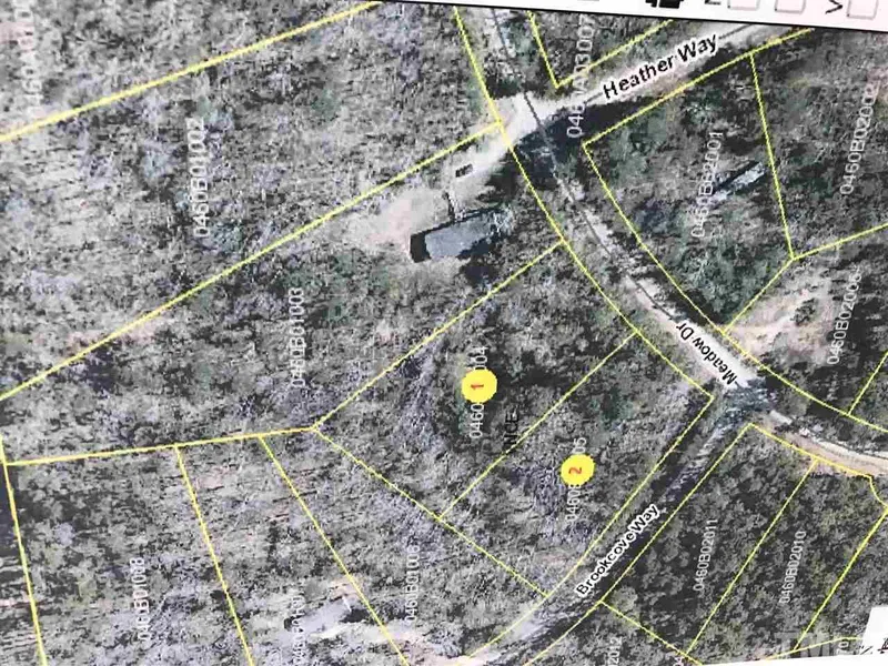 The 2.8+ acre lot is split almost in half by a drainage ditch from other side of Meadow Dr. Therefore this lot can be divided into 2 lots. There is a septic tank partially buried on Lot 1 Meadow Dr and Brookcove Way. There is also a older partially cleared path coming off of Brookcove Way that can be used to enter from that road.