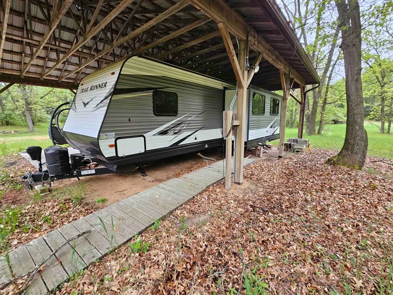 Just a little NW of Wisconsin Dells you'll find this sweet Adams County vacation spot. Perfect combination of woods and privacy and open areas for activities. Just purchase and start relaxing!! Covered camper area on a pad with a with a gazebo, fire pit, 2-car garage, and a 2020 Trail Runner 3 BR camper which can stay or the seller will keep it. This place is the ideal set-up with the 110 electric & 30 amp camper panel installed, and well and septic to meet Adams County zoning requirements. You might be vacationing here for a long time or be building your getaway cabin/year-round home on your 2.48 acres. Up to 2 campers can be placed here w/ water hookups, so there's room for everyone. One of the best set-ups you'll find, and no mess/no fuss.