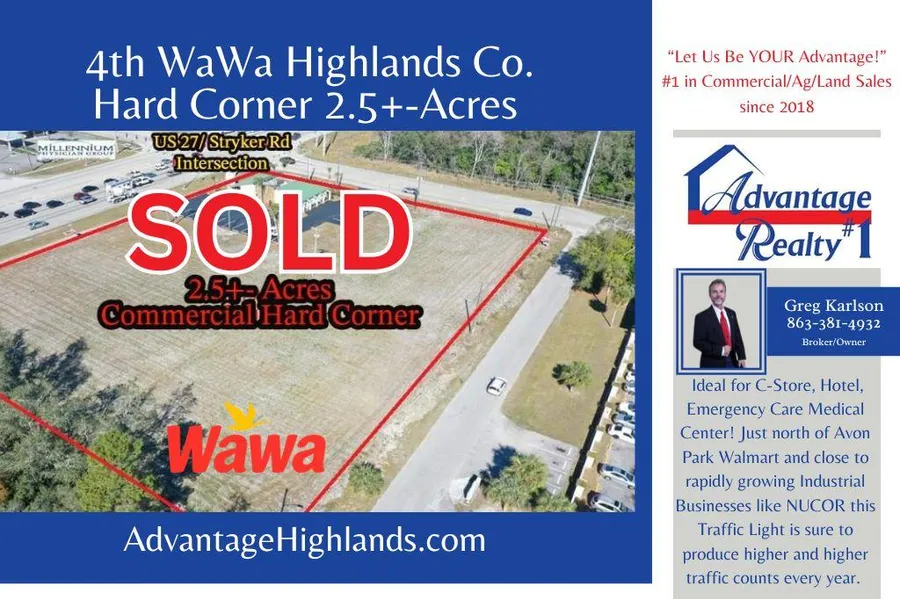 Prime Hard Corner 2.5+-Acres Ideal for C-Store, Hotel, Emergency Care Medical Center! Just north of Avon Park Walmart and close to rapidly growing Industrial Businesses like NUCOR this Traffic Light is sure to produce higher and higher traffic counts every year. Don't miss out on this opportunity.