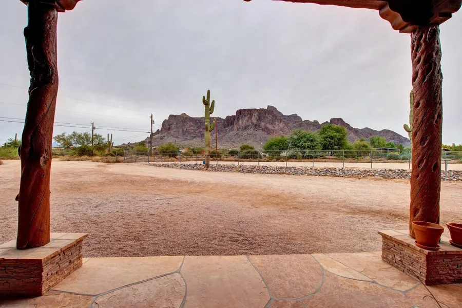 Imagine looking out over you arena at the Superstition Mountains... Saddling your horse and heading out on the trails right from your back yard. This beautiful home sits on 2.5 acres, with amazing views and the perfect horse set up offering a 6 stall mare motel, 16x16 stalls, 60 foot round pen, tack shed, covered wash rack, turn out with shade and a nice size riding arena. The home offers 3 bedrooms, 2 bathrooms, split floor plan with a formal dining room and cozy eat in kitchen. Three car garage with lots of storage, plenty of room to park your horse trailer. Beautiful custom wood vagus throughout the home. The best part of your day will be sitting on the patio or on the view deck with the sun setting over the mountains- hurry this home will not last long!