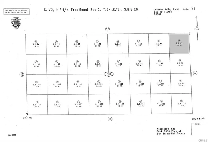 Lucerne Valley. Two and half acres of beautiful raw land close to Harrod and Camp rock, just north of Jones. Latitude and longitude coordinates are 34.555468,34.555468. Land has views of mountains and is about a half hour drive to Big Bear, Apple Valley, and far enough from town yet close enough for essential needs and supplies. This could be a very nice getaway- to early morning desert sunrises. This could be a good property to hold or use. Parcel number is 0453-511-02-0000.