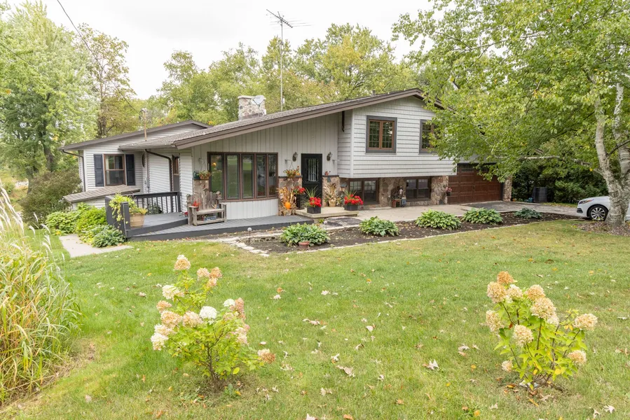 This exterior of this picturesque property has a huge pond with a river running nearby on the 2.66 acre country lot that includes a garden area with fruit trees and netted blueberry bushes for the gardening enthusiast. The river has a bridge crossing for access to the garden and wooded hunting area and features an outbuilding for storing tractors, lawnmowers, tools or toys.